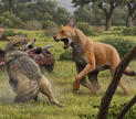 The dire wolf was one of the most iconic predators of the late Pleistocene, known for its powerful build and formidable presence. Heavier and more robust than modern gray wolves, it had strong jaws, thick limbs, and a muscular body designed for grappling large prey. Its broad skull and massive teeth allowed it to crush bone with ease, giving it a clear advantage when feeding on tough carcasses. Dire wolves thrived across a wide range of environments including grasslands, open forests, and plains.Daily life for a dire wolf centered on movement, cooperation, and constant search for food. These wolves targeted large herbivores such as ancient bison, horses, camels, and young mammoths when opportunities arose. Their hunting relied on stamina and teamwork rather than stealth or speed. Packs spread out to track prey over long distances, then worked together to exhaust and bring down animals much larger than themselves. Like modern wolves, they likely scavenged when needed, using their strong jaws to access marrow and bones left untouched by other predators.Social structure was essential to a dire wolf’s success. Packs were likely led by dominant individuals who maintained order, established territory, and guided group movements. Young wolves learned by observing adults and participating in cooperative hunts as they matured. Pack members groomed one another, shared food, and defended their territory as a unified group. These bonds strengthened their ability to survive in landscapes filled with competing carnivores.In the presence of other animals, dire wolves were confident yet strategic. They shared territory with giant short-faced bears, saber-toothed cats, American lions, and other powerful predators. Confrontations over kills were common, and dire wolves often had to defend their hard-earned meals from much larger rivals. With herbivores, their behavior was shaped by opportunity; they followed herds, watched for weak individuals, and took advantage of moments when prey became vulnerable. Their interactions helped shape the movements and alertness of nearly every species that lived alongside them.Dire wolves played a key role in maintaining ecological balance throughout the Pleistocene. By hunting large herbivores, they helped regulate prey populations and influenced migration patterns. As scavengers, they contributed to cleaning the landscape of carcasses, reducing disease risks and supporting nutrient cycling. Their powerful presence, complex social behavior, and adaptability made them dominant predators of their time, leaving a lasting legacy in the fossil record and in the story of North America’s ancient wildlife.